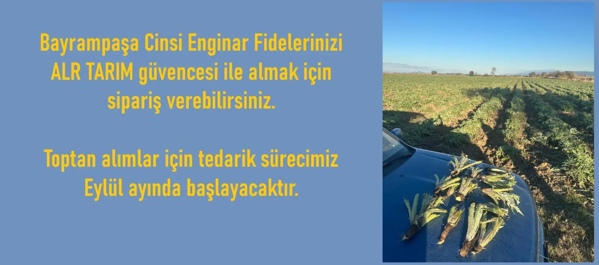 ALR Tarım Bursa'nın Mustafakemalpaşa ilçesine bağlı Ormankadı Mahallesi'nde 250.000m2 alanda yıllık 400.0000 enginar kapasitesiyle tarımsal üretim yapmaktadır. Ürün yelpazesinin lokomotifi Bayrampaşa cinsi enginar oluşturmaktadır. Bu üretim yolculuğunu her aşamasında sizlerle paylaşarak hem müşterilerimizi iş ortağımız haline getireceğiz, hem de tarımsal üretimin ne kadar zorlu bir yolculuk olduğunu paylaşacağız. Topraktan sofraya uzanan bu yolculukta, sizin için en iyisini sunmaya devam edeceğiz.